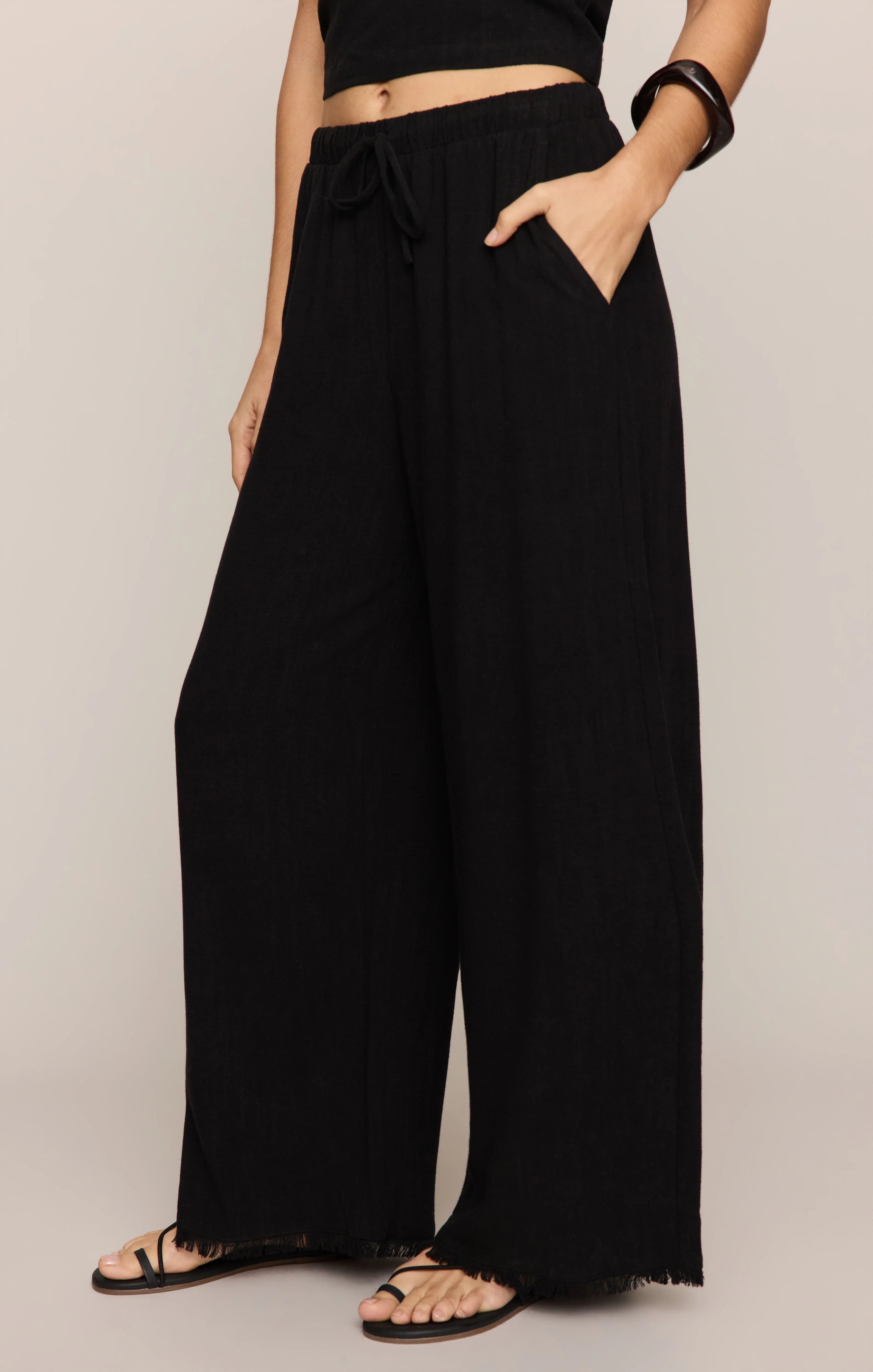 Easygoing and a little bit undone, these straight leg linen pants have that perfectly relaxed feel. The high-rise fit and elastic waistband with a drawcord keep them comfortable, while the frayed hem adds a touch of carefree style. Slash pockets give them a practical finish, making them perfect for laid-back days.